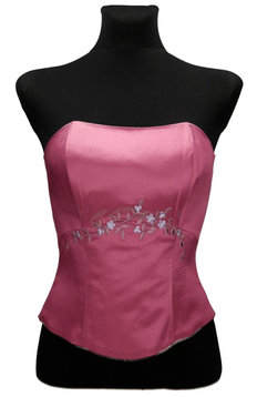 Gorset z fiszbinami wiązany z tyłu, Gorsetem podkreślisz piękne ramiona i uwydatnisz biust, wiązaniem z tyłu dobrze go dopasujesz. Materiał - połyskująca tafta z kwiatowym haftem.  Dopasowana góra, podkreślona talia  to klasa i styl. Gorset uzupełni twoją garderobę, można nosić go zarówno do spodni jak i spódnic.