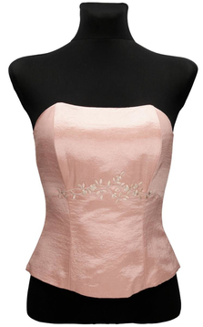 Gorset z fiszbinami wiązany z tyłu, Gorsetem podkreślisz piękne ramiona i uwydatnisz biust, wiązaniem z tyłu dobrze go dopasujesz. Materiał - połyskująca tafta z kwiatowym haftem.  Dopasowana góra, podkreślona talia  to klasa i styl. Gorset uzupełni twoją garderobę, można nosić go zarówno do spodni jak i spódnic.