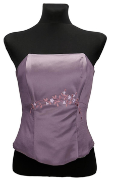 Gorset z fiszbinami wiązany z tyłu, Gorsetem podkreślisz piękne ramiona i uwydatnisz biust, wiązaniem z tyłu dobrze go dopasujesz. Materiał - połyskująca tafta z kwiatowym haftem. Dopasowana góra, podkreślona talia to klasa i styl. Gorset uzupełni twoją garderobę, można nosić go zarówno do spodni jak i spódnic.