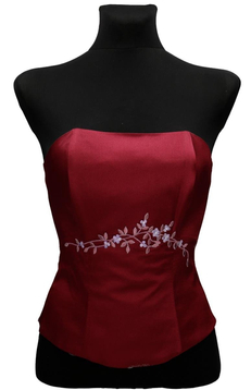 Gorset z fiszbinami wiązany z tyłu, Gorsetem podkreślisz piękne ramiona i uwydatnisz biust, wiązaniem z tyłu dobrze go dopasujesz. Materiał - połyskująca tafta z kwiatowym haftem.  Dopasowana góra, podkreślona talia  to klasa i styl. Gorset uzupełni twoją garderobę, można nosić go zarówno do spodni jak i spódnic.