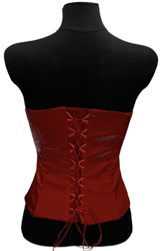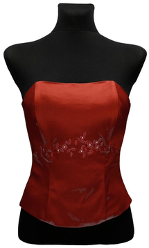 Gorset z fiszbinami wiązany z tyłu, Gorsetem podkreślisz piękne ramiona i uwydatnisz biust, wiązaniem z tyłu dobrze go dopasujesz. Materiał - połyskująca tafta z kwiatowym haftem. Dopasowana góra, podkreślona talia to klasa i styl. Gorset uzupełni twoją garderobę, można nosić go zarówno do spodni jak i spódnic.