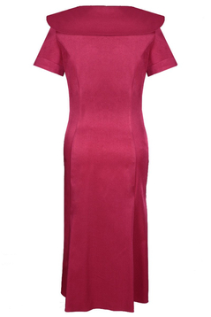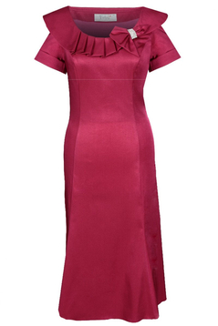 Sukienka wizytowa. Dekolt okrągły, podkreślony ozdobnym kołnierzem. Jest on asymetryczny, posiada liczne zakładki, oraz fantazyjne upięcie zakończone broszką. Rękaw krótki, z mankietem. Zarówno z przodu jak i z tyłu znajdują się pionowe cięcia, optycznie wyszczuplające sylwetkę. Dołem rozkloszowana. Sukienka została uszyta z eleganckiej tkaniny - delikatnie elastyczna. Z tyłu na górze suwak kryty ułatwiający zakładanie. Sukienka idealna dla kobiet ceniących świetny wygląd i komfort w użytkowaniu. Można w niej wystąpić na weselu, komunii, i wielu innych uroczystościach.