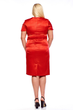 Klasyczna, dopasowana sukienka. Uszyta została z eleganckiej, delikatnie połyskującej tkaniny w połączeniu z koronką. Dekolt okrągły, rękaw krótki. Przód fantazyjnie wymodelowany. W talii wszyty został pasek z delikatnym haftem. Z tyłu suwak kryty, natomiast na dole rozporek umożliwiający swobodne chodzenie. Jest podszewka. Sukienka powstała z myślą o kobietach dojrzałych, ceniących elegancki wygląd. Sukieneczka idealna na wesele, komunie i wiele innych uroczystości.