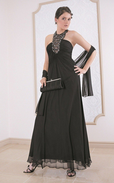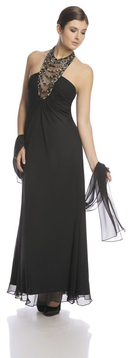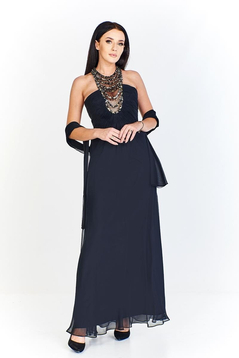Długa wieczorowa sukienka, uszyta z jedwabnego szyfonu. Przód bogato zdobiony koralikami, cekinami i błyszczącymi kamieniami. Zarówno na przodzie jak i na tyle od środka do boków miękko układa się draperia, tworząc efektowne promienie. Dekolt głęboki, odważny eksponujący biust. Sukienka długa dopasowana w biuście, natomiast w pasie i biodrach luźna, co pozwala zatuszować niedoskonałości. Sukienka zapinana na szyi dwoma haftkami. Plecy częściowo odkryte. Suwak kryty z tyłu. Podszewka  100 % acetat. Sukienka sprawdzi się na wielu imprezach takich jak: wesele, studniówka, sylwester, osiemnastka i wiele innych.