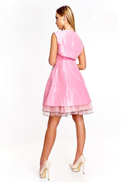 Zestaw sukienka + bolerko. Bolerko oraz sukienka zostały uszyte z niezwykle szykownej tafty. Sukienka na cieniutkich, regulowanych ramiączkach. Dekolt- serduszko. Dopasowana w talii, dół rozkloszowany, usztywniony podwójną warstwą tiulu, widoczną spod spodu. Na podszewce. Z przodu i z tyłu cięcia modelujące, przez całą długość sukienki. Z przodu czarny haft z dodatkiem połyskujących nici, częściowo wypukły (największe, całe czarne kwiatki na górze sukienki). Dodatkowo krawędź dekoltu (przód i tył) obszyta małymi koralikami. Zapięcie na boku- kryty suwak. Bolerko bez rękawów, zakrywające plecy. Krótkie. Z tyłu na środku cięcie oraz dwie zaszewki modelujące. Zestaw elegancki, idealny na wesele.