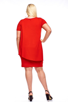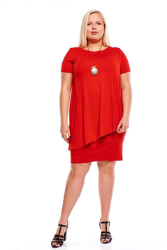 Dwuwarstwowa sukienka. Spód to prosta dopasowana tkanina. Doskonale opina każdą figurę, wierzch jest luźny i asymetryczny, z lewej, krótszej strony niezszyty. Układa się bardzo efektownie, tuszuje niedoskonałości sylwetki. Bardzo wygodna, nie krępuje ruchów. Dekolt w kształcie łódki, rękaw zwykły, krótki. Sukienka uszyta została z bardzo elastycznej, lejącej dzianiny – wiskozy. Skład surowcowy: 90% wiskoza, 10% elastan. Sukienkę polecamy kobietom w każdym wieku, na co dzień. Po dobraniu odpowiednich dodatków można stworzyć bardzo udaną stylizację na bardziej uroczyste wyjścia. Jeśli chcesz wyglądać wyjątkowo i czuć się komfortowo to ta sukienka jest właśnie dla Ciebie.