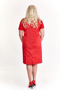 Klasyczna, dopasowana sukienka. Uszyta została z eleganckiej, delikatnie połyskującej tkaniny w połączeniu z koronką. Dekolt serek, rękaw krótki. Talia podkreślona paskiem, wszytym w pionowe cięcia. Z tyłu suwak kryty, natomiast na dole rozporek umożliwiający swobodne chodzenie. Jest podszewka. Sukienka powstała z myślą o kobietach dojrzałych, ceniących elegancki wygląd. Sukieneczka idealna na wesele, komunie i wiele innych uroczystości.