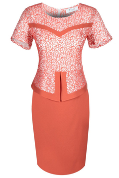 Sukienka uszyta z połączenia dwóch materiałów. Dekolt okrągły z przodu w tali baskinka. Baskinka z przodu jest znacznie dłuższa niż z tyłu. Suwak do talii, cała sukienka bez podszewki. Góra sukienki oraz baskinka uszyta została z ciekawej dzianiny, Wzór na tej dzianinie przypomina naszywane sznureczki.
