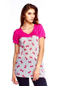 Tunika codzienna. Została  uszyta z bardzo miłej w dotyku dzianiny oraz szyfonu. Jest luźna, dopasuje się do każdej figury. Dekolt okrągły. Rękaw - krótki, z mankietem o szerokości 3,5 cm. Dół przodu z lewej strony dłuższy, z pęknięciem. Tunika świetnie komponuje się w zestawieniu z legginsami lub spodniami z wąskimi nogawkami.