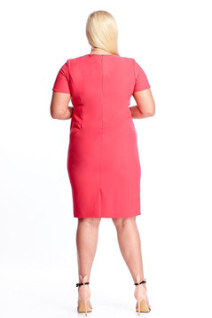 Prosta elegancka sukienka uszyta z najwyższej jakości lekko rozciągliwej tkaniny. W pastelowych  zestawach kolorystycznych do wyboru. Delikatny okrągły dekolt imitujący kołnierz ze srebrnym guziczkiem w formie dekoracji. Rękaw krótki. Cięcie francuskie plus odcięcie w talii sprawiają, że sylwetka wygląda na szczuplejszą i smuklejszą. Z tyłu suwak i dyskretny rozporek. Materiał jest miły w dotyku i nie ulega gnieceniu. Sukienka idealna dla dojrzałych kobiet. Idealnie kryje mankamenty figury. W zależności od dodatków sprawdzi się zarówno w dzień jak i na wieczorne wyjścia.