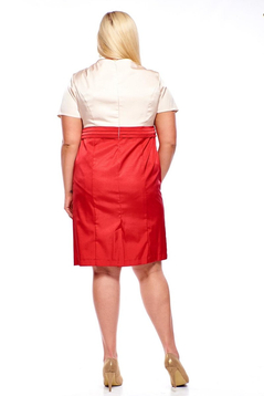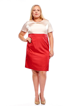 Wizytowa sukienka. Dekolt okrągły, ozdobiony wypustką. W dekolcie znajdują się zakładki nachodzące na siebie, tworząc wrażenie asymetrii. Rękawy krótkie. Na karczku przodu pionowe cięcia modelujące biust oraz talię. Odcięta w pasie, podkreślona trzema zakładkami przeszytymi poziomo. Sukienka uszyta została z tkaniny elastycznej z delikatnym połyskiem. Jest podszewka. Z tyłu na górze suwak kryty ułatwiający zakładanie. Na dole rozporek umożliwiający swobodne chodzenie. Sukienka idealna dla kobiet ceniących świetny wygląd i komfort w użytkowaniu. Można w niej wystąpić na weselu, komunii, i wielu innych uroczystościach.