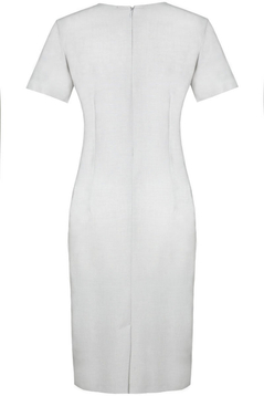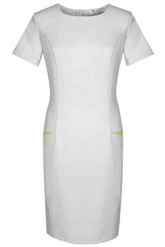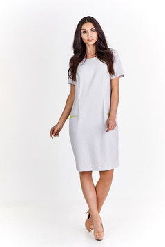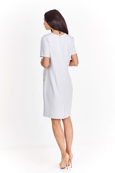 Klasyczna, prosta lekko taliowana sukienka. Dekolt półokrągły, wykończony lamówką. Rękaw krótki. Na przodzie cięcie modelujące biust, przechodzące w kieszeń. Kieszenie podkreślone kontrastowym akcentem. Zapinana na suwak kryty z tyłu, ułatwiający zakładanie, na dole rozporek pozwalający na swobodne chodzenie. Idealna  na co dzień, do pracy imprezy w plenerze.