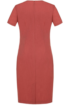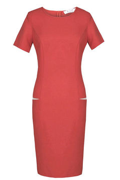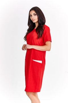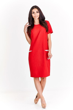 Klasyczna, prosta lekko taliowana sukienka. Dekolt półokrągły, wykończony lamówką. Rękaw krótki. Na przodzie cięcie modelujące biust, przechodzące w kieszeń. Kieszenie podkreślone kontrastowym akcentem. Zapinana na suwak kryty z tyłu, ułatwiający zakładanie, na dole rozporek pozwalający na swobodne chodzenie. Idealna  na co dzień, do pracy imprezy w plenerze.