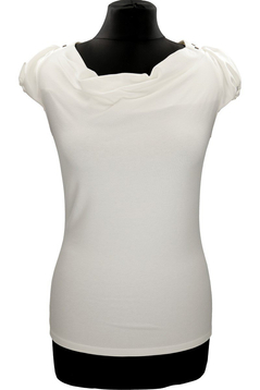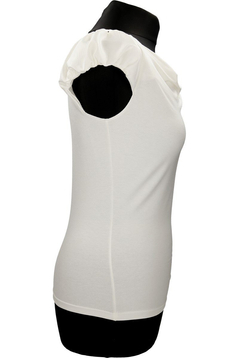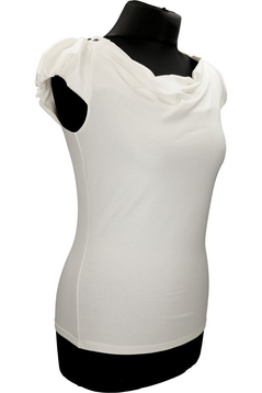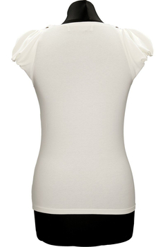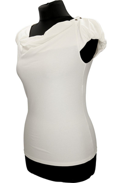 Bluzka na lato, została uszyta z bardzo elastycznej, cienkiej dzianiny – wiskozy. Z przodu dekolt układający się w „wodę”. Na ramionach ćwieki. Rękaw – reglan, uszyty z delikatnej szyfonowej tkaniny w kolorze bluzki. Rękaw krótki, marszczony zarówno na górze jak i na dole. Bluzka została zaprojektowana z myślą o dziewczynach i kobietach w różnym wieku. Doskonale komponuje się z ołówkową spódnicą lub z jeansami, tworząc udane stylizacje na każdy dzień.