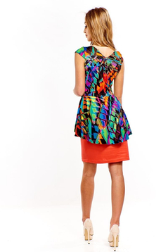 Sukienka z baskinką. Dekolt z przodu okrągły, z tyłu serek. Rękawek krótki, bardzo delikatny. Biust wyprofilowany cięciem francuskim. Baskinka z przodu jest znacznie krótsza niż z tyłu. Bez suwaka, bez podszewki. Góra sukienki oraz baskinka uszyta została z wielokolorowej dzianiny, część spódnicowa gładka. Sukieneczka jest dość krótka, kierowana głównie do młodych i odważnych kobiet, które chcą wyglądać modnie i elegancko.