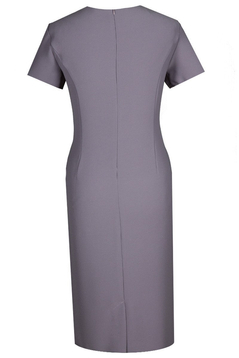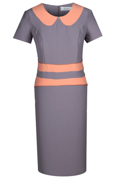 Prosta elegancka sukienka uszyta z najwyższej jakości lekko rozciągliwej tkaniny. W pastelowych zestawach kolorystycznych do wyboru. Delikatny okrągły dekolt imitujący kołnierz ze srebrnym guziczkiem w formie dekoracji. Rękaw krótki. Cięcie francuskie plus odcięcie w talii sprawiają, że sylwetka wygląda na szczuplejszą i smuklejszą. Z tyłu suwak i dyskretny rozporek. Materiał jest miły w dotyku i nie ulega gnieceniu. Sukienka idealna dla dojrzałych kobiet. Idealnie kryje mankamenty figury. W zależności od dodatków sprawdzi się zarówno w dzień jak i na wieczorne wyjścia.