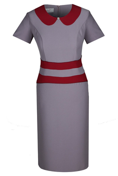 Prosta elegancka sukienka uszyta z najwyższej jakości lekko rozciągliwej tkaniny. W pastelowych  zestawach kolorystycznych do wyboru. Delikatny okrągły dekolt imitujący kołnierz ze srebrnym guziczkiem w formie dekoracji. Rękaw krótki. Cięcie francuskie plus odcięcie w talii sprawiają, że sylwetka wygląda na szczuplejszą i smuklejszą. Z tyłu suwak i dyskretny rozporek. Materiał jest miły w dotyku i nie ulega gnieceniu. Sukienka idealna dla dojrzałych kobiet. Idealnie kryje mankamenty figury. W zależności od dodatków sprawdzi się zarówno w dzień jak i na wieczorne wyjścia.