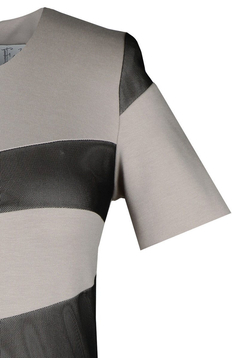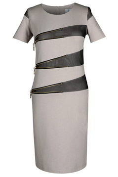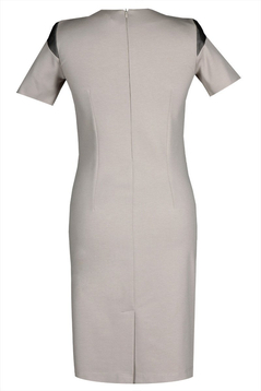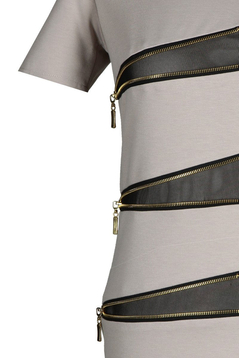 Asymetryczna sukienka. Linia dopasowana. Uszyta została z miłej w dotyku i przyjemnej dla ciała dzianiny. Dekolt okrągły. Rękaw krótki. Ozdobę stanowią wstawki na rękawach oraz w pasie. Są one uszyte z elastycznego tiulu. W pasie wstawki podkreślone metalowymi suwakami w kolorze złotym. Z tyłu suwak kryty oraz rozporek ułatwiający swobodne chodzenie. W pasie z tyłu zaszewki. Bez podszewki. Sukienka powstała z myślą o dziewczynach i kobietach w różnym wieku. Idealna na kameralne spotkania w gronie rodziny lub znajomych.