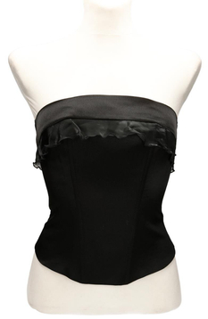 Gorset z fiszbinami wiązany z tyłu, Z przodu i z tyłu kontrastowa falbanka oraz wiązanie. Gorsetem podkreślisz piękne ramiona i uwydatnisz biust, wiązaniem z tyłu dobrze go dopasujesz. Dopasowana góra, podkreślona talia to klasa i styl. Gorset uzupełni twoją garderobę, można nosić go zarówno do spodni jak i spódnic.