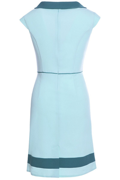 Klasyczna, dopasowana sukienka. Dekolt okrągły z efektownym kołnierzem. Na ramionach jest delikatna, wąska plisa. Z przodu i z tyłu cięcia francuskie. Talia podkreślona wypustką. Sukienka została uszyta z lekko elastycznej tkaniny, która nie ulega gnieceniu i mechaceniu. Bez podszewki. Z tyłu suwak kryty, oraz rozporek ułatwiający swobodne chodzenie. Sukienka przeznaczona jest dla kobiet w różnym wieku na uroczyste okazje, np. wesela, ale można ją nosić również na co dzień.