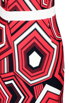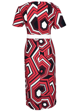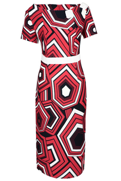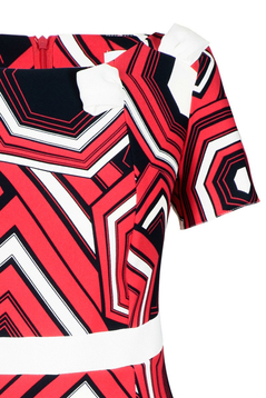 Prosta, dopasowana sukienka. Dekolt okrągły, podkreślony wszytą kokardą po lewej stronie. Rękaw krótki. Sukienka została uszyta z miłej w dotyku, delikatnie elastycznej tkaniny. Materiał jest wzorzysty. Kokardka oraz pasek w tali zostały uszyte z gładkiego materiału. Sukienka nie posiada podszewki. Tkanina użyta do produkcji nie ulega gnieceniu i mechaceniu. Z tyłu suwak kryty, na dole rozporek ułatwiający swobodne chodzenie. Sukienka została zaprojektowana z myślą o kobietach dojrzałych, lubiących wyglądać elegancko przy każdej okazji.