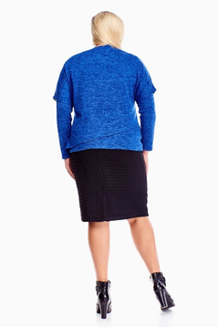 Dwuczęściowa bluzka. Spód dopasowany – prosta klasyczna bluzeczka z długim rękawem, natomiast wierzch luźny - asymetryczny. Prawy bok krótszy z obszernym rękawem kimono. Obie części uszyte zostały z tego samego materiału, ze sweterkowej, grubej dzianiny. Bluzkę można nosić również osobno, wierzch idealnie komponuje się z prostą bluzką koszulą i wraz z ołówkową spódnicą tworzą bardzo udaną stylizację. Komplet powstał z myślą o dziewczynach i kobietach w różnym wieku, lubiącym wyglądać modnie i elegancko.
