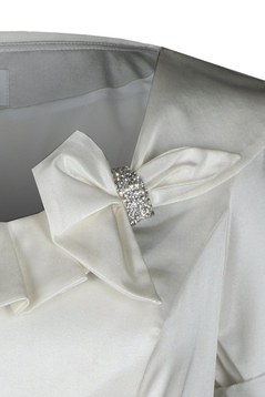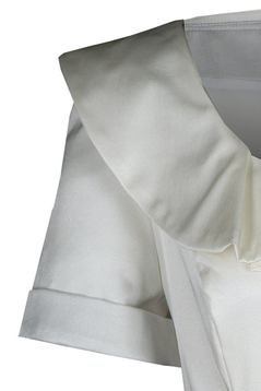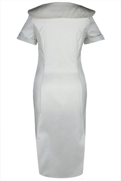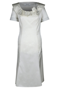 Sukienka wizytowa. Dekolt okrągły, podkreślony ozdobnym kołnierzem. Jest on asymetryczny, posiada liczne zakładki, oraz fantazyjne upięcie zakończone broszką. Rękaw krótki, z mankietem. Zarówno z przodu jak i z tyłu znajdują się pionowe cięcia, optycznie wyszczuplające sylwetkę. Dołem rozkloszowana. Sukienka została uszyta z eleganckiej tkaniny - delikatnie elastyczna. Z tyłu na górze suwak kryty ułatwiający zakładanie. Sukienka idealna dla kobiet ceniących świetny wygląd i komfort w użytkowaniu. Można w niej wystąpić na weselu, komunii, i wielu innych uroczystościach.