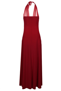 Długa sukienka. Uszyta została z lejącej dzianiny. Wiązanie na szyi zaczyna się pod biustem i kończy na karku. Do jego produkcji użyto miękkiego tiulu. Góra sukienki wykończona gumą, co zapobiega samowolnemu zsuwaniu się sukieneczki z sylwetki. Odcięcie pod biustem, podkreślone cekinowym paskiem. Poniżej zakładki. Dół sukienki mocno rozkloszowany. Bez podszewki. Bez suwaka. Sukienka idealna na uroczyste spotkania, np. wesela, studniówki i wiele innych okazji.