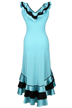 Niezwykle oryginalna sukienka idealna na wesele. Dostępna w dziesięciu zestawach kolorystycznych. Uszyta z lekko ciągliwej tkaniny, miłej w dotyku. Dekolt w serek obszyty cekinami, dodatkowo wykończony trzema fantazyjnymi falbankami. Takie same falbany zdobią dół sukienki, dzięki temu nabiera ona romantycznego charakteru. Z tyłu również delikatny dekolt w serek. Sukienka lekko opina ciało podkreślając atuty kobiecej sylwetki, dzięki czemu nikt nie przejdzie obok Ciebie obojętnie.
