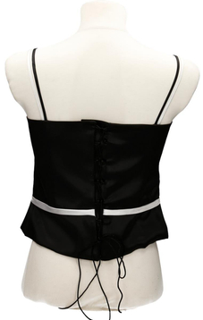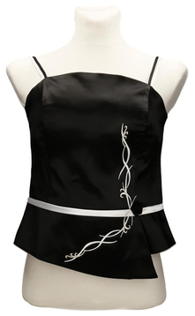 Gorset z fiszbinami wiązany z tyłu, Dół gorsetu jest z przodu asymetryczny, a talia zaznaczona jest kontrastową taśmą. Gorsetem podkreślisz piękne ramiona i uwydatnisz biust, wiązaniem z tyłu dobrze go dopasujesz. Materiał- połyskująca satyna z kwiatowym wzorem. Dopasowana góra, podkreślona talia to klasa i styl. Gorset uzupełni twoją garderobę, można nosić go zarówno do spodni jak i spódnic.