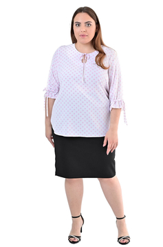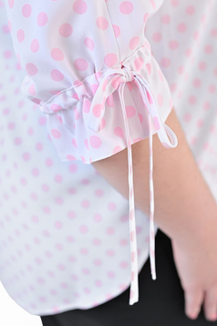 Elegancka bluzka wykończona z przodu ozdobnym rozcięciem i wiązaniem na sznureczki. Z tyłu jest zapięcie w kształcie łezki na guziczek z pętelką. Rękaw ¾ z wiązaniem tworzącym falbankę. Produkt ma asymetryczny krój - dół jest zaokrąglony a tył koszuli jest delikatnie dłuższy od przodu.