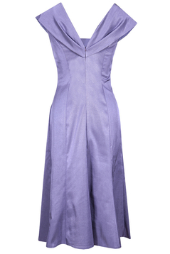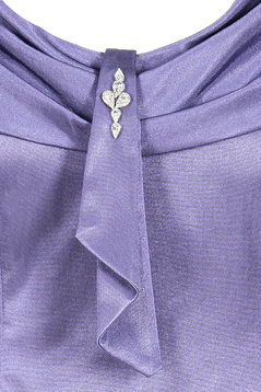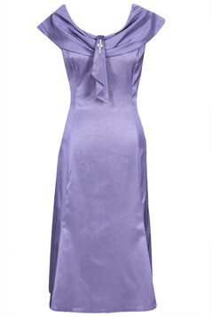 Sukienka wizytowa. Dekolt okrągły wykończony bardzo ozdobnym, opadającym na ramiona, szerokim kołnierzem. Na środku przodu, na kołnierzu znajdują się zakładki. Cięcia pionowe, dodają sylwetce lekkości. Dół poszerzany. Suwak kryty z tyłu. Jest podszewka, ale kończy się w okolicy pasa. Sukienka została uszyta z tkaniny lekko elastycznej, z delikatnym połyskiem. Sukienkę polecamy kobietom dojrzałym, na ważne uroczystości, np. wesela, komunie i wiele innych okazji.