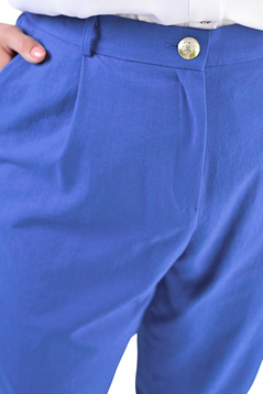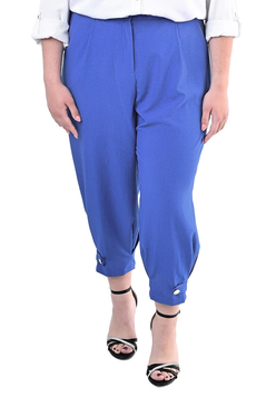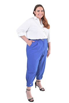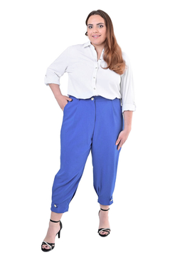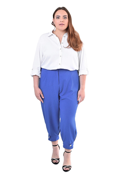 Spodnie typu pumpy z wysokim stanem, zapinane na zamek i guzik. W tali z przodu pasek, a od boku na całym tyle gumka, dodatkowo szlufki aby można było dodatkowo dopasować rozmiar. Spodnie posiadają kieszenie oraz dodatkowo na nogawce patkę która dodatkowo marszczy nogawkę.