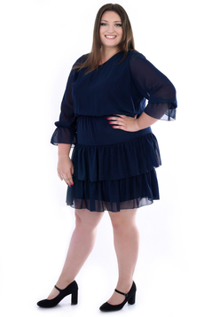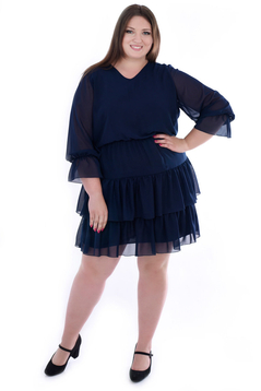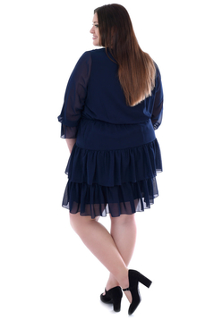 Sukienka o luźnym fasonie, uszyta z wzorzystej tkaniny . Dekolt okrągły. Rękaw  ¾ z gumką i falbanką . W tali gumka podkreślająca lekko talię. Na dole sukienki 2 szerokie falbany. Rękawy oraz dół  wykończony  mereżką. Przód i tył sukienki ma podszewkę. Została zaprojektowana z myślą o kobietach, w różnym wieku, chcącym wyglądać modnie i elegancko.