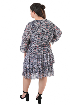 Sukienka o luźnym fasonie, uszyta z wzorzystej tkaniny . Dekolt okrągły. Rękaw ¾ z gumką i falbanką . W tali gumka podkreślająca lekko talię. Na dole sukienki 2 szerokie falbany. Rękawy oraz dół wykończony mereżką. Przód i tył sukienki ma podszewkę. Została zaprojektowana z myślą o kobietach, w różnym wieku, chcącym wyglądać modnie i elegancko.