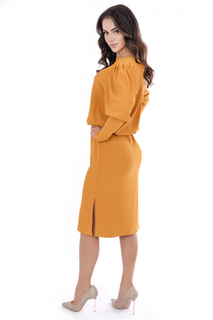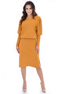 Sukienka wykonana z dzianiny prążkowanej. Górna część sukienki luźna z bufkami i zwężanym do dołu rękawem, w tali gumka, dół to prosta spódnica z rozporkami po bokach.