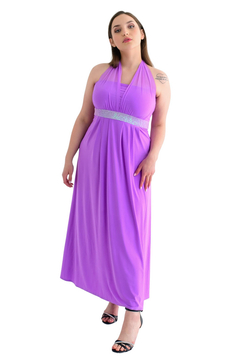 Długa sukienka. Uszyta została z lejącej dzianiny. Wiązanie na szyi zaczyna się pod biustem i kończy na karku. Do jego produkcji użyto miękkiego tiulu. Góra sukienki wykończona gumą, co zapobiega samowolnemu zsuwaniu się sukieneczki z sylwetki. Odcięcie pod biustem, podkreślone cekinowym paskiem. Poniżej zakładki. Dół sukienki mocno rozkloszowany. Bez podszewki. Bez suwaka. Sukienka idealna na uroczyste spotkania, np. wesela, studniówki i wiele innych okazji.