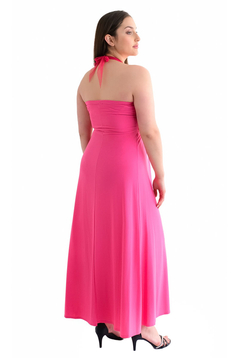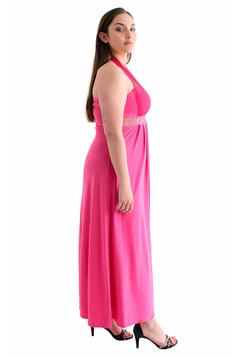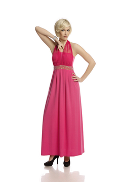 Długa sukienka. Uszyta została z lejącej dzianiny. Wiązanie na szyi zaczyna się pod biustem i kończy na karku. Do jego produkcji użyto miękkiego tiulu. Góra sukienki wykończona gumą, co zapobiega samowolnemu zsuwaniu się sukieneczki z sylwetki. Odcięcie pod biustem, podkreślone cekinowym paskiem. Poniżej zakładki. Dół sukienki mocno rozkloszowany. Bez podszewki. Bez suwaka. Sukienka idealna na uroczyste spotkania, np. wesela, studniówki i wiele innych okazji.