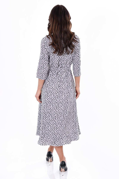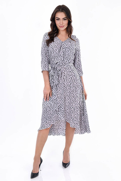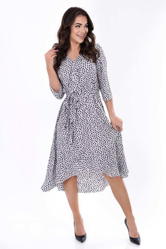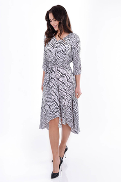 Sukienka jest uszyta z delikatnej tkaniny przez co ładnie układa się na figurze i nie krępuje ruchów.