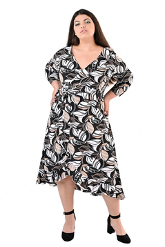 Sukienka FSU1073 CZARNY beżowo ekri liście
