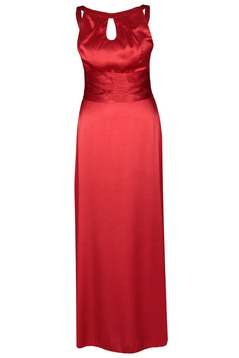 Sukienka maxi, w zestawie z bolerkiem. Kreacja została uszyta z eleganckiego materiału – połyskującej satyny. Na środku przodu łezka oraz drobne, symetryczne zakładki. Marszczony szeroki pas „rzeźbi” talię, wiązany jest z tyłu. Sukienka dopasowana jest w biuście oraz w pasie, poniżej poszerza się, tworząc zapas na obfite biodra. Plecy częściowo odkryte. Suwak kryty z boku. Sukienkę polecamy na wesela, studniówki oraz inne imprezy okolicznościowe.