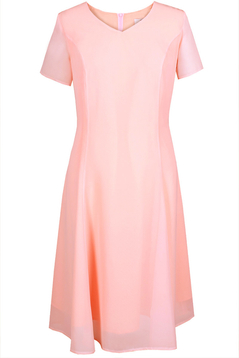 Piękna, niesamowicie kobieca sukienka. Z połączenia dwóch materiałów - spodnia tkanina a na niej transparentny szyfon, który nadaje kreacji całą skromną elegancję. Rozkloszowany fason, długość w kolanko i bucik na obcasie to sam wdzięk i klasa. Wybierając jasne/pastelowe kolory stworzysz stylizację na komunię lub chrzciny. Natomiast ciemne kolory w zestawieniu z biżuterią lub ciekawymi błyskotkami z pewnością olśniewająco będziesz wyglądać na weselu lub innej wieczorowej imprezie.  Do tego dobierz elegancki żakiet bądź szal. A może szukasz coś na popołudniowe spotkanie z przyjaciółką? wybierz nasz model w groszki, włóż letni kapelusz i ciesz się aurą wiosny/lata. Występuje w palecie wielu kolorów i wzorów. Idealna na wiosenne i letnie dni. Polecamy kobietom w różnym wieku.