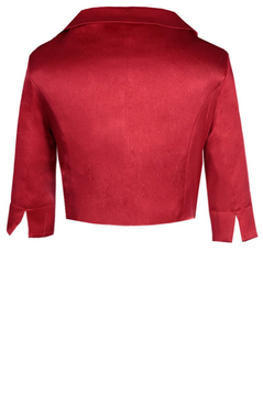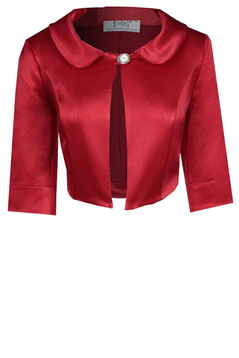 Żakiet wizytowy. Dekolt okrągły, wykończony kołnierzem. Zapinany na jeden ozdobny guzik. Rękaw 3/4, z małym pęknięciem oraz wywijanym mankietem. Żakiet kończy się w okolicy pasa. Uszyty został z gładkiej, eleganckiej tkaniny. Jest podszewka. Idealnie pasuje do wizytowych sukienek, jako uzupełnienie stylizacji.