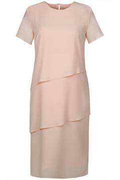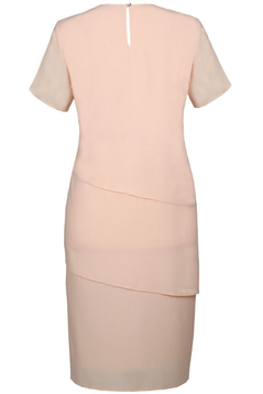Sukienka została uszyta z cienkiego zwiewnego materiału. Jest wykończona podszewką. Dekolt okrągły. Sukieneczka zapinana jest z tyłu na mały guziczek. Skośne falbany zarówno z przodu jak i z tyłu optycznie wyszczuplają sylwetkę. Rękaw krótki. Sukienka jest luźna, nie posiada suwaka. Sukienka idealna na uroczyste spotkania w gronie rodziny i przyjaciół.
