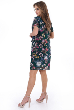 Sukienka została uszyta z cienkiego zwiewnego materiału. Jest wykończona podszewką. Dekolt okrągły. Sukieneczka zapinana jest z tyłu na mały guziczek. Skośne falbany zarówno z przodu jak i z tyłu optycznie wyszczuplają sylwetkę. Rękaw krótki. Sukienka jest luźna, nie posiada suwaka. Sukienka idealna na uroczyste spotkania w gronie rodziny i przyjaciół.