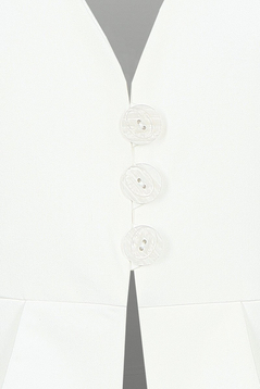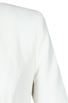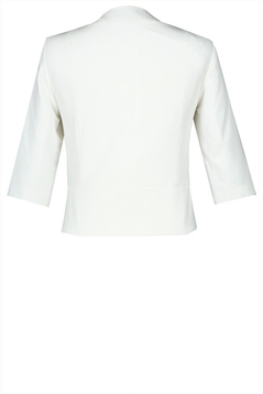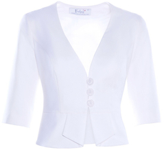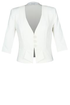 Elegancki żakiet z tkaniny, na podszewce. Bez kołnierza, bez poduszek w ramionach. Na przodzie cięcia francuskie, na dole fantazyjna zakładka, na pasku szerokości ok. 11 cm. Rękaw 3/4. Zapinany na 3 guziki z pętelką. Z tyłu cięcia przechodzące od ramienia do talii. Uniwersalny, świetnie łączy się z innymi częściami garderoby, np. z sukienką będzie tworzyć idealny zestaw na wesela czy inne imprezy okolicznościowe, ze spódnicą na spotkania rodzinne czy służbowe. Każda kobieta będzie w nim wyglądać modnie i atrakcyjnie.