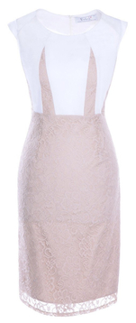 Wizytowa sukienka. Dekolt okrągły. Bez rękawów. Odcięta w pasie. Z tyłu na górze suwak kryty ułatwiający zakładanie, oraz na dole rozporek zakładany, umożliwiający swobodne chodzenie. Sukienka uszyta została głównie z koronki. Pod koronkowymi elementami została podłożona tkanina - krepa, jest to materiał elastyczny, miły w dotyku. Sukienka idealna dla kobiet ceniących świetny wygląd i komfort w użytkowaniu. Można w niej wystąpić na weselu, komunii, i wielu innych uroczystościach.