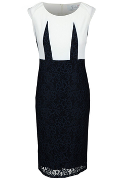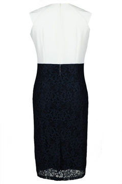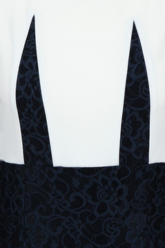Wizytowa sukienka. Dekolt okrągły. Bez rękawów. Odcięta w pasie. Z tyłu na górze suwak kryty ułatwiający zakładanie, oraz na dole rozporek zakładany, umożliwiający swobodne chodzenie. Sukienka uszyta została głównie z koronki. Pod koronkowymi elementami została podłożona tkanina - krepa, jest to materiał elastyczny, miły w dotyku. Sukienka idealna dla kobiet ceniących świetny wygląd i komfort w użytkowaniu. Można w niej wystąpić na weselu, komunii, i wielu innych uroczystościach.