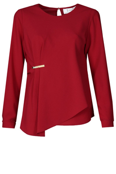 Luźna bluzka. Dekolt okrągły. Przód jest dwuwarstwowy. Część wierzchnia jest asymetryczna, w pasie znajdują się zakładki, podkreślone złotą blaszką. Rękaw długi, zakończony mankietem zapinanym na guzik. Na środku tyłu pęknięcie, zapinane na pętelkę i guzik, umożliwiające zakładanie. Bluzka została uszyta z cienkiej, delikatnej tkaniny przypominającej szyfon. Skład surowcowy: 50% poliester, 45 poliamid, 5% elastan. Bluzeczka dedykowana jest dziewczynom i kobietom w różnym wieku. Idealnie pasuje do ołówkowej spódnicy. Można ją wykorzystać w bardzo wielu formalnych stylizacjach.