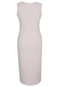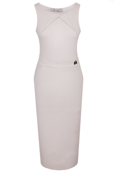 Klasyczna, ołówkowa sukienka. Poszczególne kolory mogą różnić się materiałem. Część sukienek została uszyta z tkaniny, a część z dzianiny. Zaleca się zapytać obsługę sklepu, który kolor z jakiego materiału został uszyty. Dekolt okrągły, podkreślony dwoma zakładkami zachodzącymi na siebie. Bez rękawów. Talia zaakcentowana odcięciem w pasie. Sukienka idealna na kameralne spotkania w gronie rodziny czy znajomych.